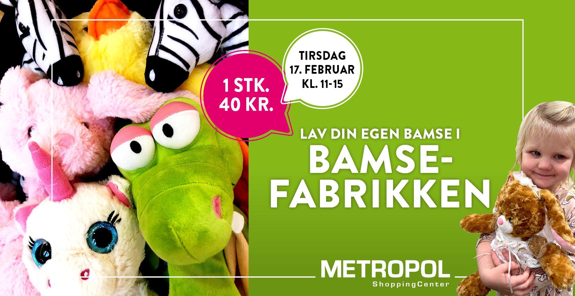 Kom forbi bamsefabrikken på centertorvet kl. 11-15 og lav din egen bamse. Vælg mellem mange forskellige. Lav 1 stk. bamse for 40 kr. Der kan kun laves 1 bamse pr. barn og kun til fremmødte børn. Der er også mulighed for at købe tøj til bamsen.