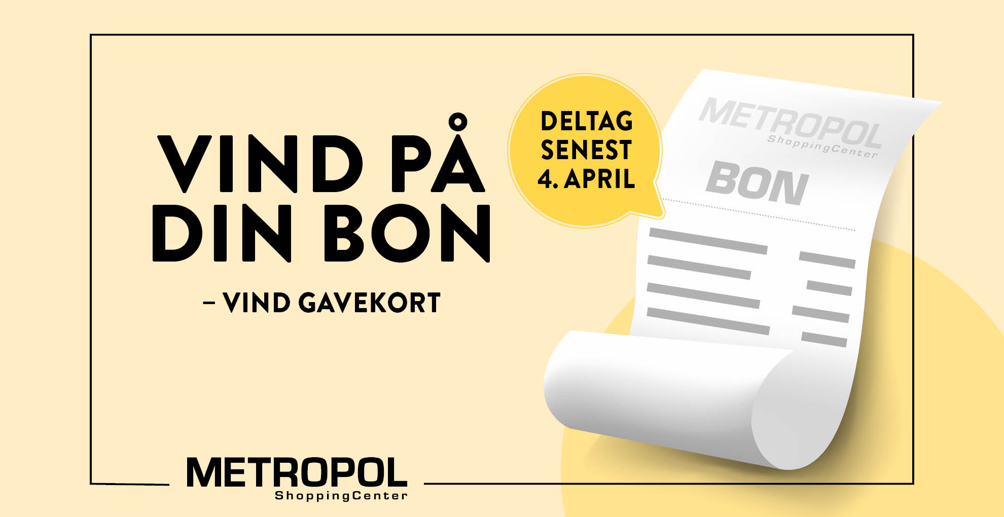 Aflever din bon og deltag i konkurrencen om 3 gavekort á 500 kr. Få en bonkopi i den butik du handler i i METROPOL ShoppingCenter – skriv navn og tlf. nr. bagpå og aflever den i konkurrencestanderen ved hovedindgangen senest lørdag 4. april. I uge 15 trækker vi 3 vindere, der hver vinder 500 kr. på et gavekort til centret. Vinderne kontaktes direkte.